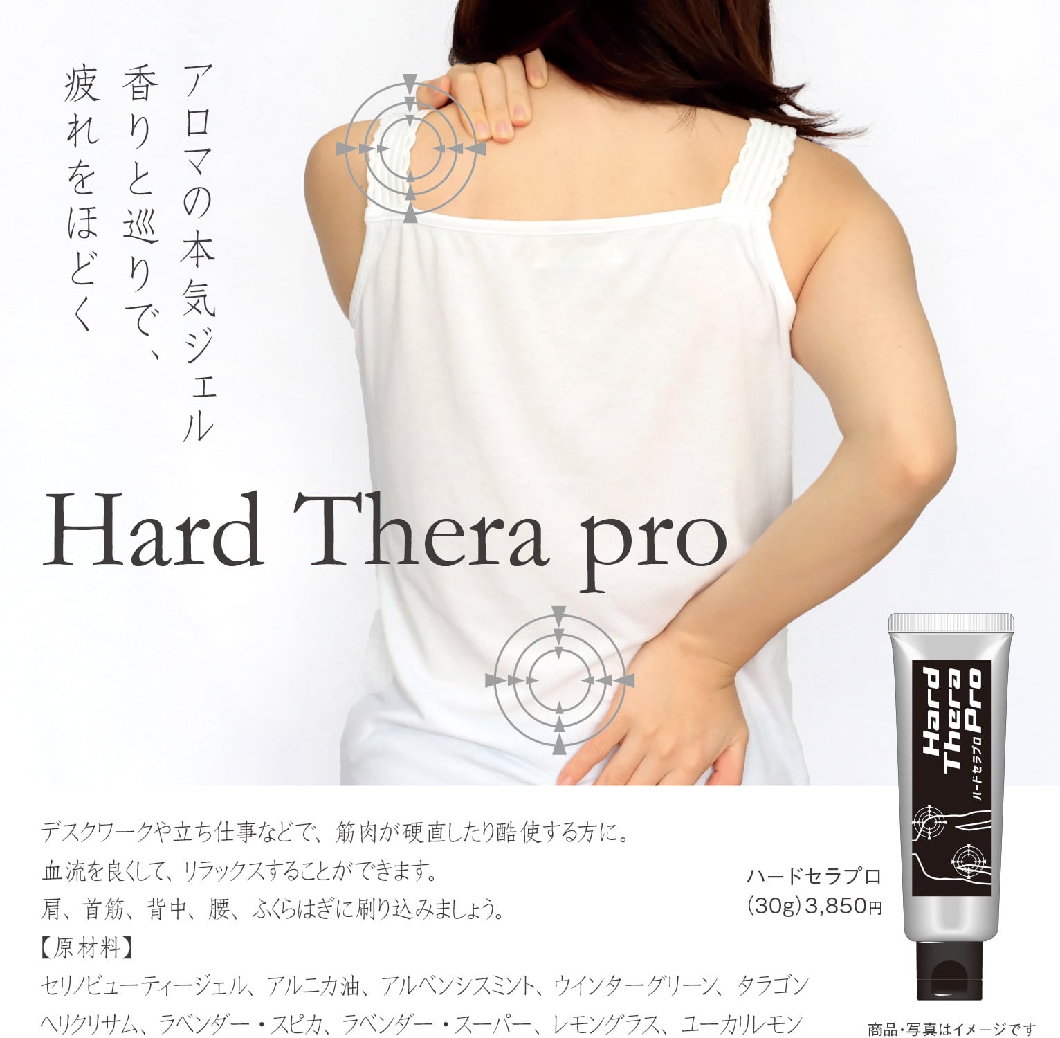 アロマジェル(成分詳細はパッケージに記載) ハードセラプロは、デスクワークや立ち仕事での筋肉疲労をサポートするアロマで構成されたジェルです。お仕事や趣味で長時間同じ姿勢でいる方にも、リラックスできるひとときを提供します。